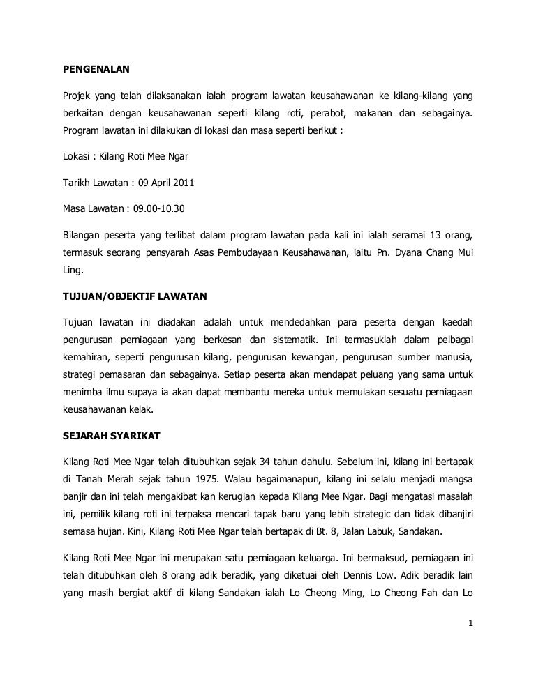 Ia amat membantu dan meningkatkan lagi semangat keyakinan saya untuk lebih mahu menerokai bidang keusahawanan setelah mendapatkan maklumat yang tepat berkaitan ilmu keusahawanan seperti konsep, mitos, visi, inovasi, penjanaan idea, rancangan perniagaan dan kini saya dapat membezakan antara peniaga Contoh laporan akhir proyek konstruksi seputar laporan. Misal reaksi kedip mata bila kena sinar, menarik jari bila kena panas, dan sebagainya. Kita perlu menambahkannya menjadi 'keberkatan kewangan'. Walaupun saya tidak mengambil opsyen ini sewaktu mendapatkan ijazah, saya pernah belajar mata pelajaran kemahiran hidup di sekolah. Peka kepada peluang saya telah merebut peluang untuk menyertai kursus ini untuk menimba ilmu pengetahuan dengan lebih mendalam tentang keusahawanan. Template laporan tugas akhir mfc. Contoh reflektif report keusahawanan for more information and source, see on this link : Contoh reflektif report keusahawanan oum for more information and source, see on this link : Kumpulan kami adalah di bawah seliaan cik hajah halimah harun. Dengan mulanya saya mengucapkan terima kasih kepada oum memberikan peluang saya melaksanakan laporan refleksi bagi khusus mpu3122 ini. Nama saya salwa binti hanapi. This preview shows page 1 out of 1 page.