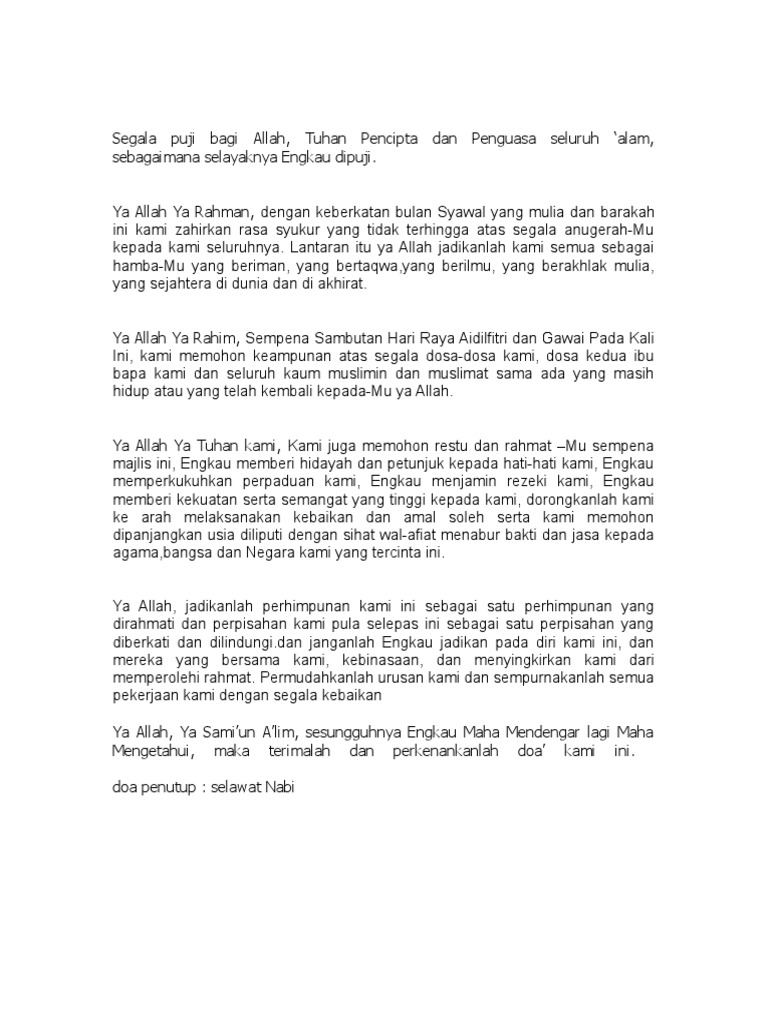 Doa Majlis Sambutan Hari Raya - Majlis dimulakan dengan ucapan aluan oleh pegawai memerintah, kdr jaffry bin ibrahim tldm dan diteruskan dengan upacara memotong kek hari lahir bagi warga kapal.. Simak √ doa pagi hari pendek, √ doa pagi hari sesuai sunnah rasulullah arab, latin dan artinya untuk mengawali pagi agar berkah. Savesave doa majlis sambutan hari raya for later. 0 ratings0% found this document useful (0 votes). Seminar kebangsaan integriti pencegah rasuah. Menurut pendapat beberapa orang pakar.