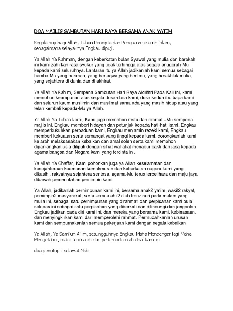 Perayaan tersebut juga dikenali sebagai hari raya puasa, hari raya fitrah atau hari lebaran. Berikut kami kongsikan bacaan doa sempena majlis sambutan aidilfiri di sekolah. Doa majlis sambutan hari raya aidil fitri. Teks pengacara majlis sambutan hari raya sekolah 2017full description. Semoga ianya memberi manfaat kepada semua.